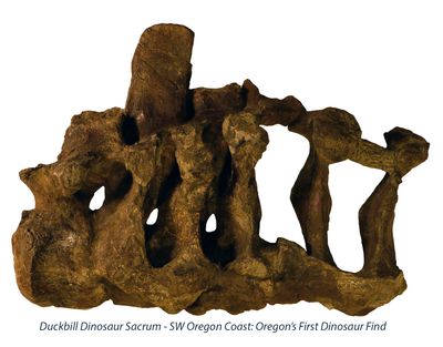 Oregon's First Dinosaur Find: A series of newspaper articles, some included below, were published on Oregon's first dinosaur. In 2018 we published on a duckbill dinosaur sacrum we excavated on the Oregon Coast in 1994 (see above). It was discovered in the 1960's by scientists with the U. S. Geological Survey. Berkeley paleontologists visited the site in 1969 and made field notes on the dinosaur specimen. National Geographic Magazine published an article in January 1993 recording the location of the dinosaur find. By 1994 we had ascertained that the specimen belonged to a duckbill, by the number of fused vertebrae together with sacral ribs. Duckbills have 8 or more sacral vertebra, which the Oregon specimen preserves. Its excavation was also featured in a 1995 story by Oregon Public Broadcasting. Books citing the dinosaur fossil include Weishampel (1990, 1992) and Weishampel et al. (2004). Also, Orr & Orr (2009 & 2012) in their editions of "Oregon Fossils" discussed the Cape Sebastian specimen and noted that it is from a probable hadrosaur.